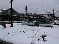 The snow creates a picturesque setting at the shore.